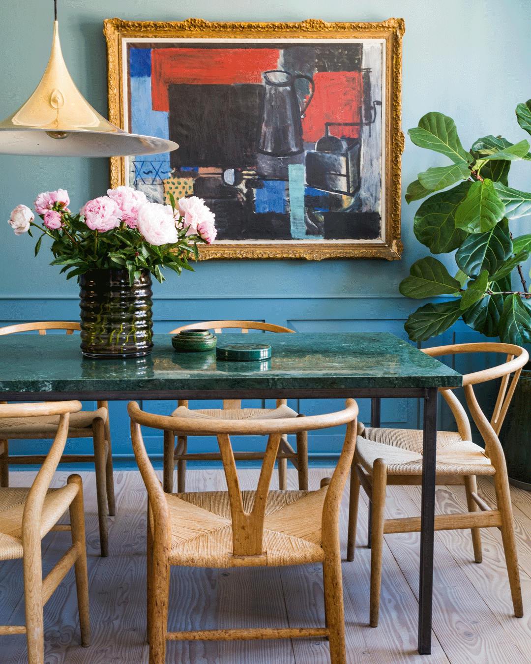 Giv et komplimenterende spil til din spisestue ved at vælge forskelligt farvede stole. Hans Olsen, der står bag de ens stole i forskellige farver, var i lære hos Kaare Klint på Skolen for Møbelkunst. Han blev under 1950’ernes modernisme især kendt for at formbøje lamineret træ. I dag er hans møbler vakt til live gennem producenten Warm Nordic. Maleriet er af Balder Olrik.