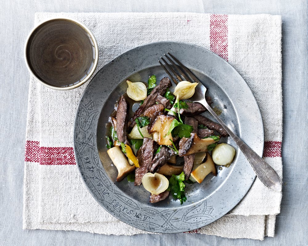 Der sker noget med den skønne bøf, når den forsigtigt vendes med svampe og syltede løg. Det et ligesom om, at hver mundfuld bliver perfekt, når det hele er samlet som en salat.