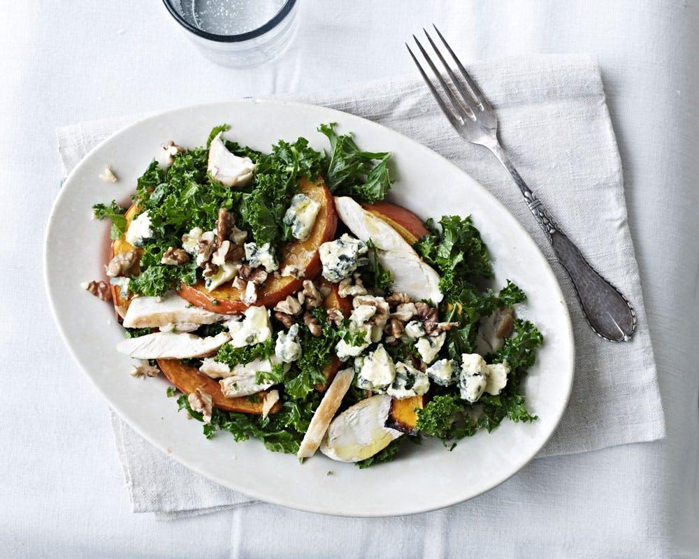 Blå ost i en salat, kan gøre underværker, men hvilken type er ikke underordnet. En Le Bleu fra Président er meget rund og mild smag, men uden at være smagløs, og en Roquefort er mere saltet i smagen, hvorimod en Gorgonzola har en næsten skarp smag. Alle tre oste går godt til grønkåls-salaten med græskar og kylling, som du får opskriften på herunder.