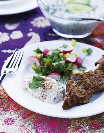 Skræl agurken med en kartoffelskræller, riv den groft og dræn den i et kaffefilter eller en si. Vrid den resterende væde ud med hånden. Hak korianderen og bland sammen med agurk, yoghurt og smag til med salt og peber.