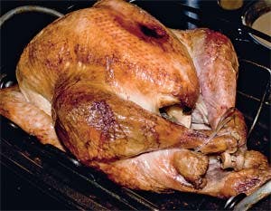 Beregn i alt fire timers tilberedningstid. Smør kalkunen med smør og drys med rigeligt salt. Placer kalkunen på risten over bradepanden, hvor der i forvejen er hældt ca. ¾ liter fond og lidt opskåret løg og gulerod. Brun kalkunen ved ca. 220°, til den er smuk og gylden, og skru derefter ned til ca. 150°. Hæft store stykker tynd spæk over brystkødet med kødnåle og dryp med fonden undervejs for at forhindre udtørring. Tag kalkunen ud ca. en halv time inden servering, så den kan stå og trække lidt med sølvpapir over sig.