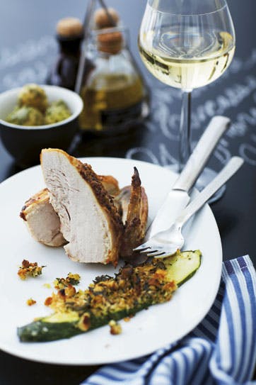 Vask courgetterne og skær dem i skiver på langs. Læg dem i et stort ildfast fad. De skal helst ligge i et lag. Fordel krummeblandingen over courgetterne, dryp med olivenolien og slut af med parmesanspånerne.