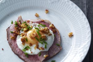 Skær kalveculotte i skiver, og server med de varme spejlæg, sprøde kartofler, skåret purløg, havsalt og friskkværnet peber. Spis biksen med godt brød og evt. en salat til.