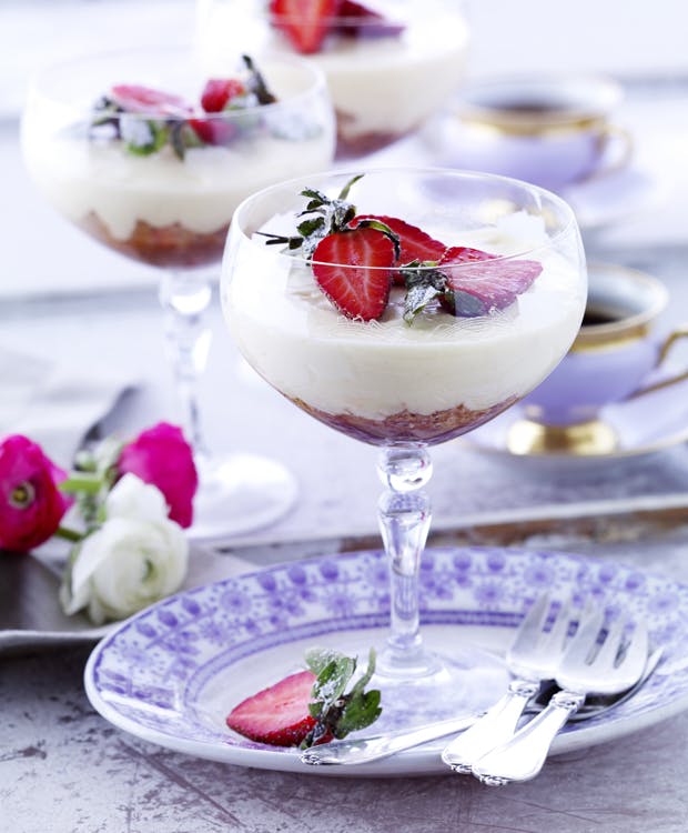 Giv den traditionelle chokolademousse en opdatering med hvid chokolade. Denne version er perfekt som afslutning på festmiddagen, med en knasende bund af makron med portvin, og en frisk sødme med jordbær på toppen.