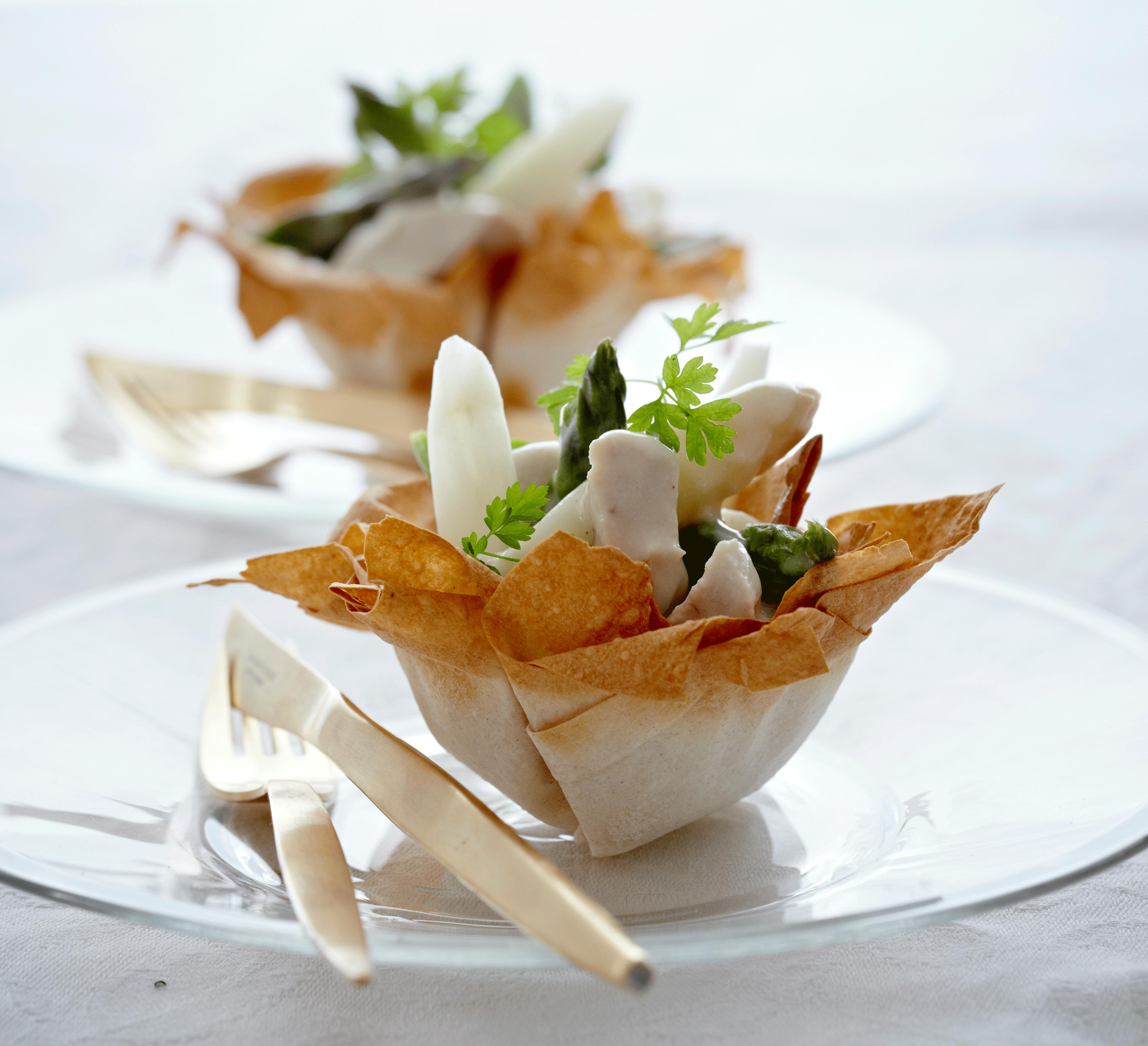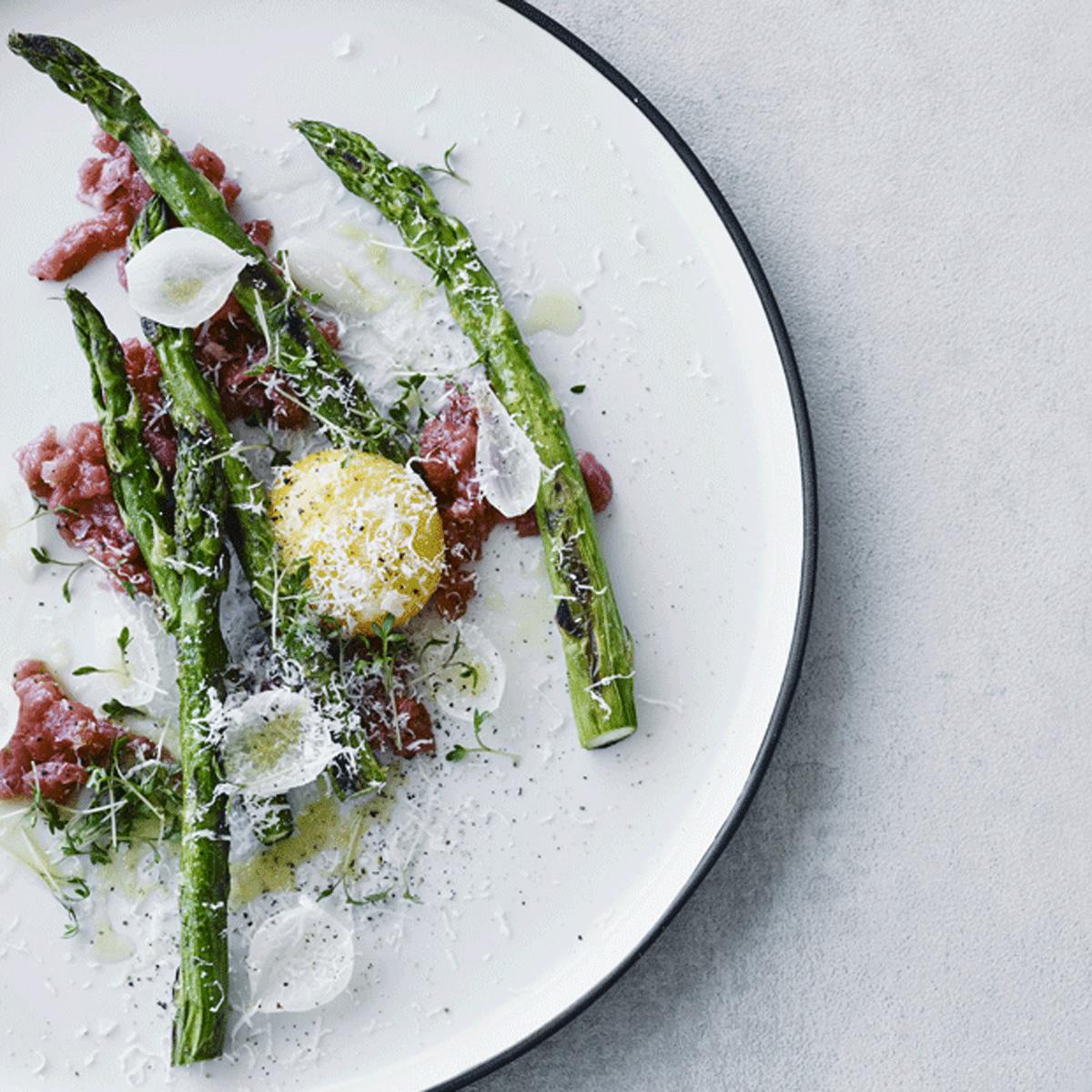 En genial måde at servere æg til påskefrokosten. Her er det kalvetatar med stegte asparges og æggeblomme.