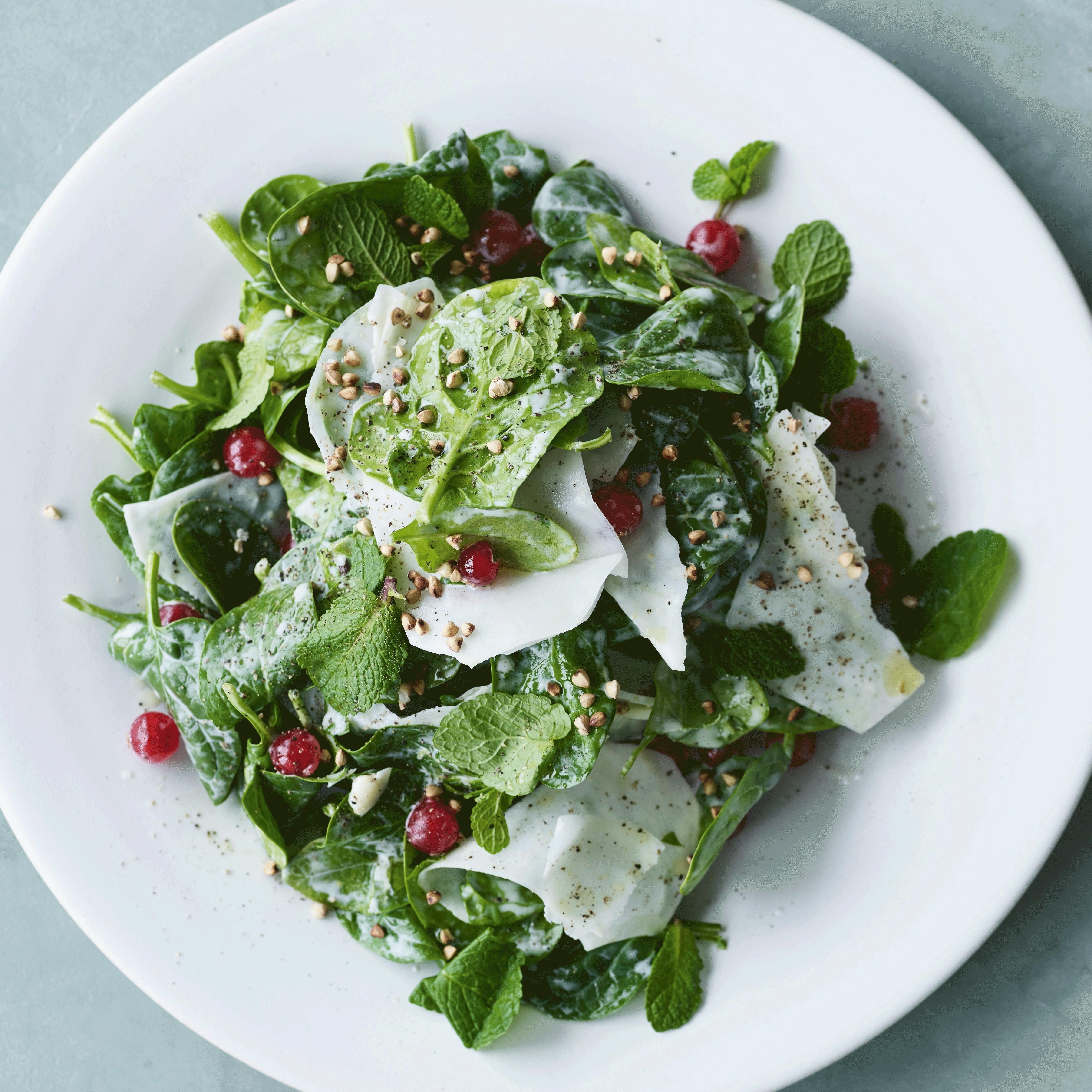Spinat-salat med ribs, glaskål og ristet boghvede