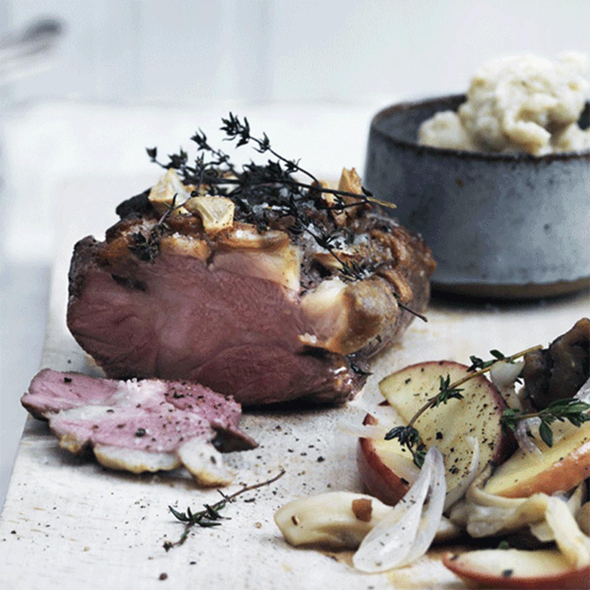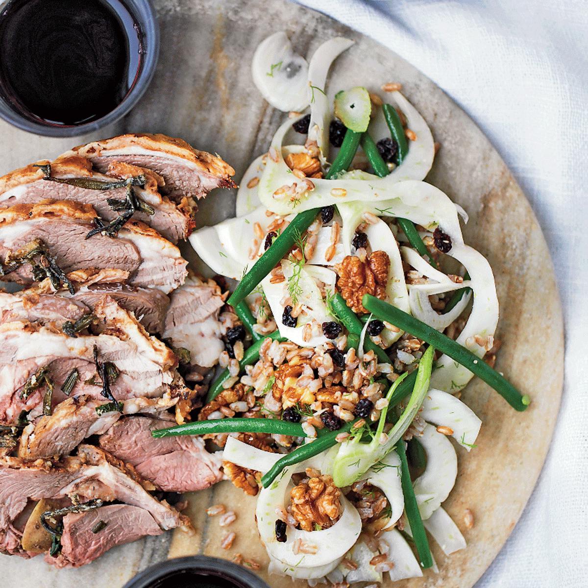 Prøv denne lammekølle med lækkert fyld af hvidløg, rosmarin, mynte og revet citronskal serveret med perlerugsalat med fennikel, valnødder og korender.