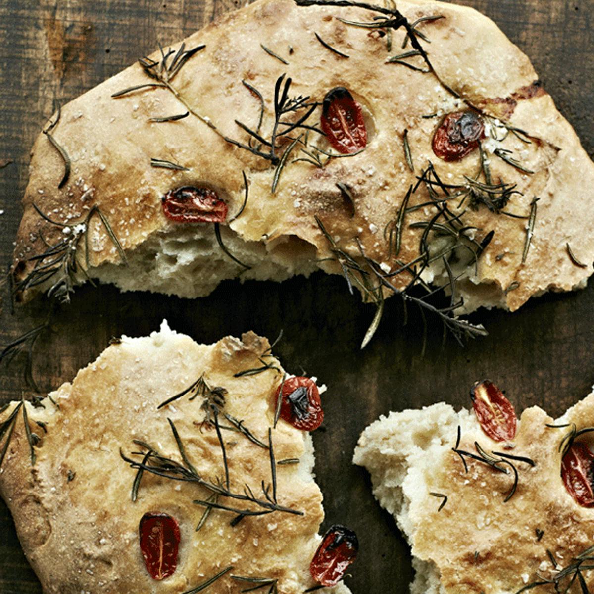 Brødet er fuld af smag og har tomat og rosmarin på toppen.
