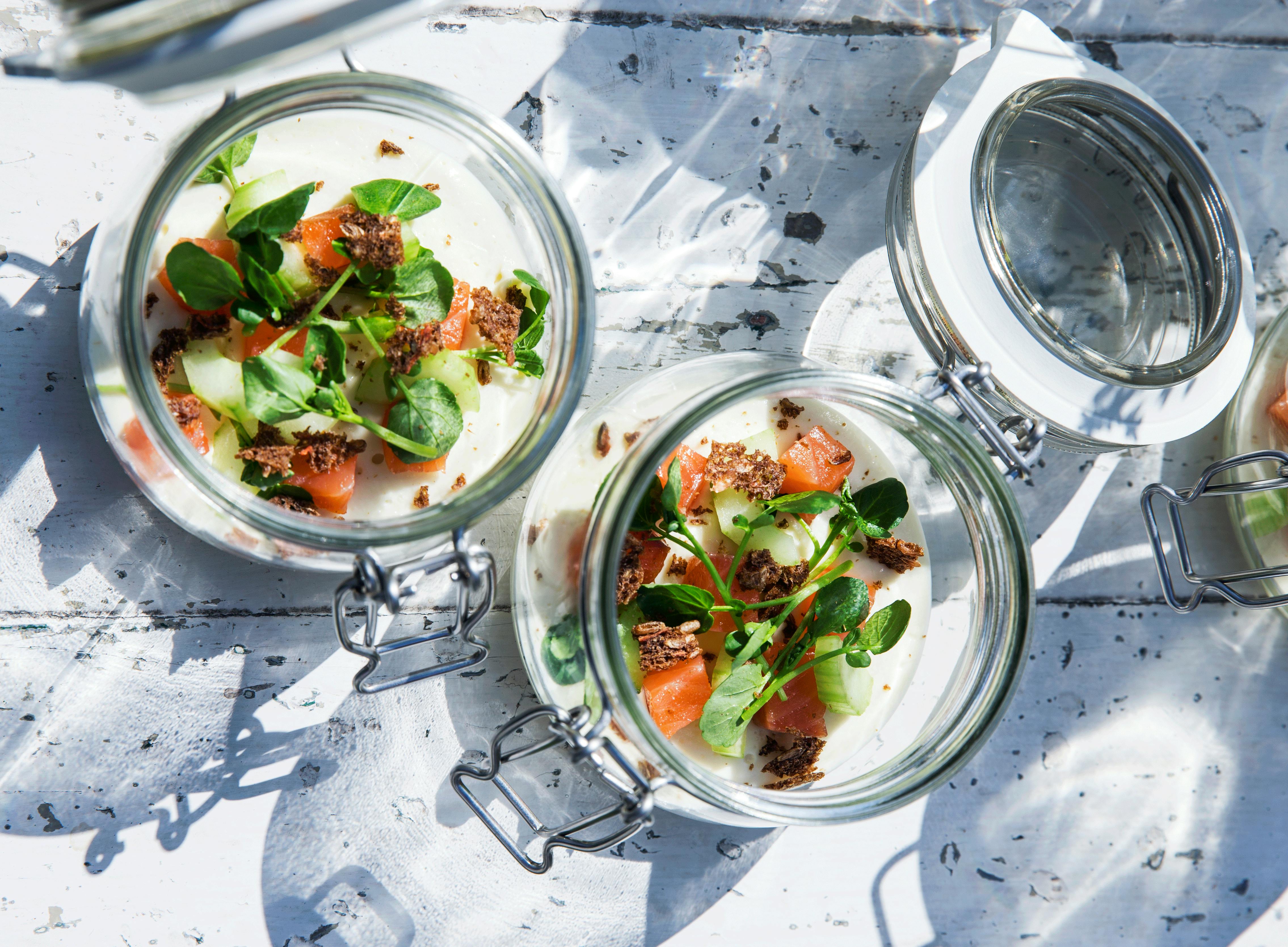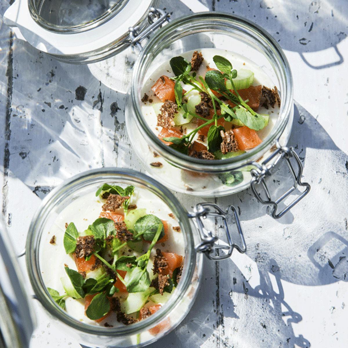 Tilføj lidt pynt til påskebordet ved at servere laksen i små glaskrukker som disse. Den lette og friske blomkålscreme kan også serveres sammen med andre typer røget fisk eller rejer.