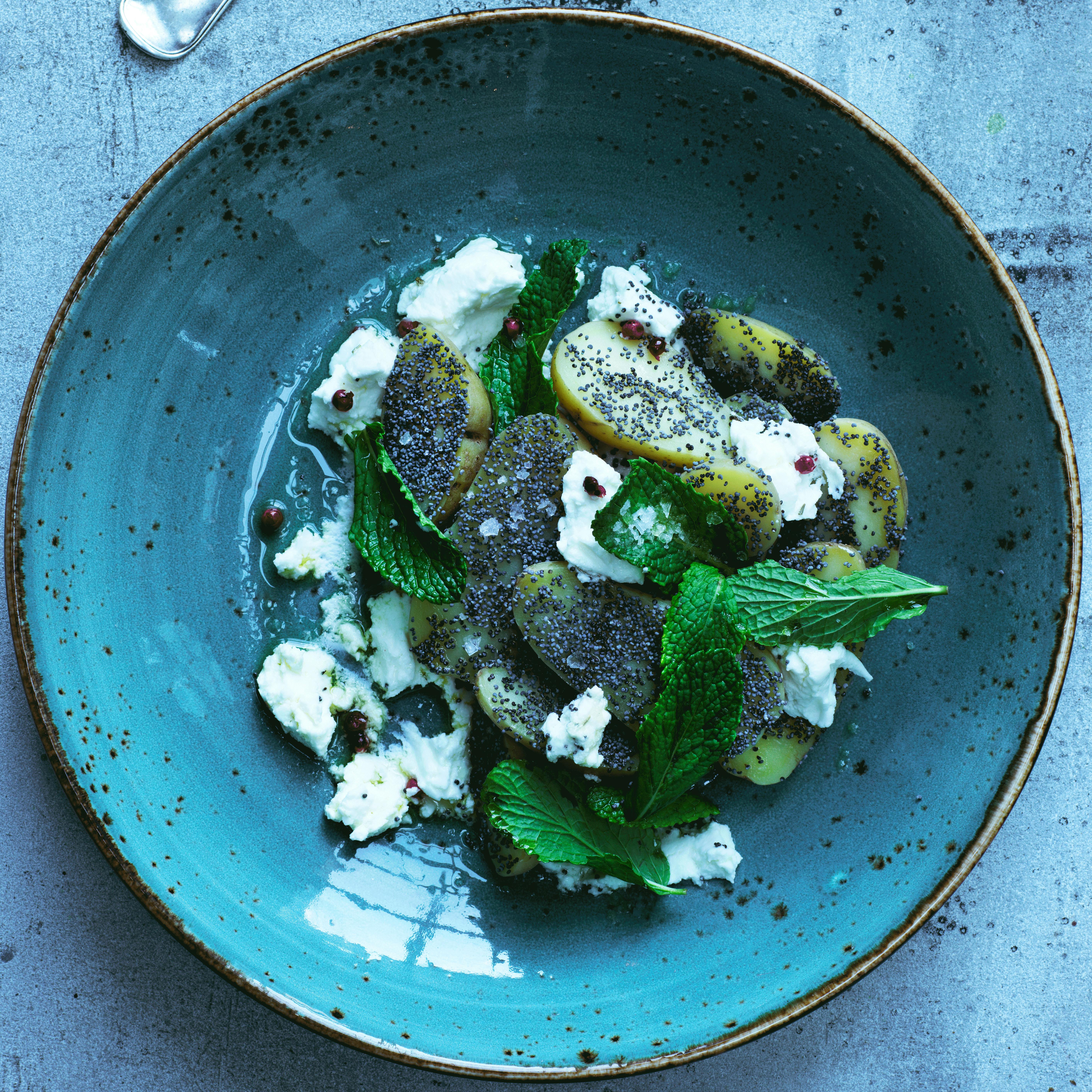 Denne opskrift på kartoffelsalat med gedeost smager af forår!