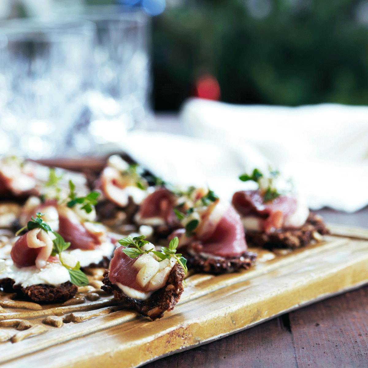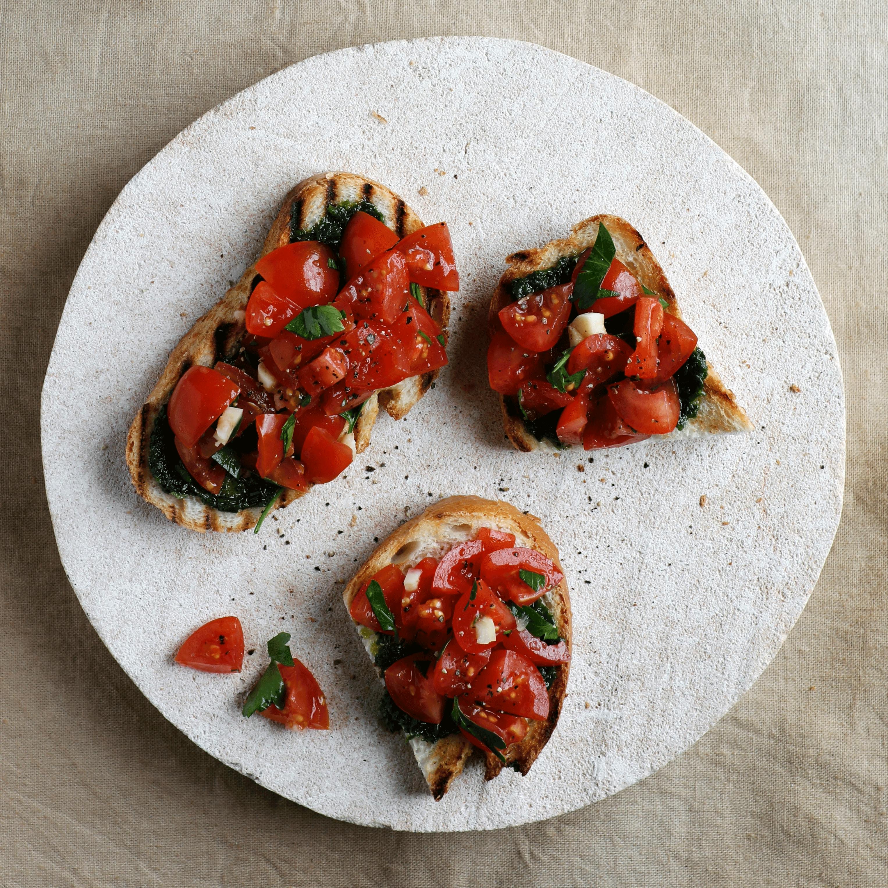 Tag et stykke af Italien med på dit påskebord. Den klassiske bruschetta har her fået et pift af ramsløg-puré og er lavet på focacciabrød.