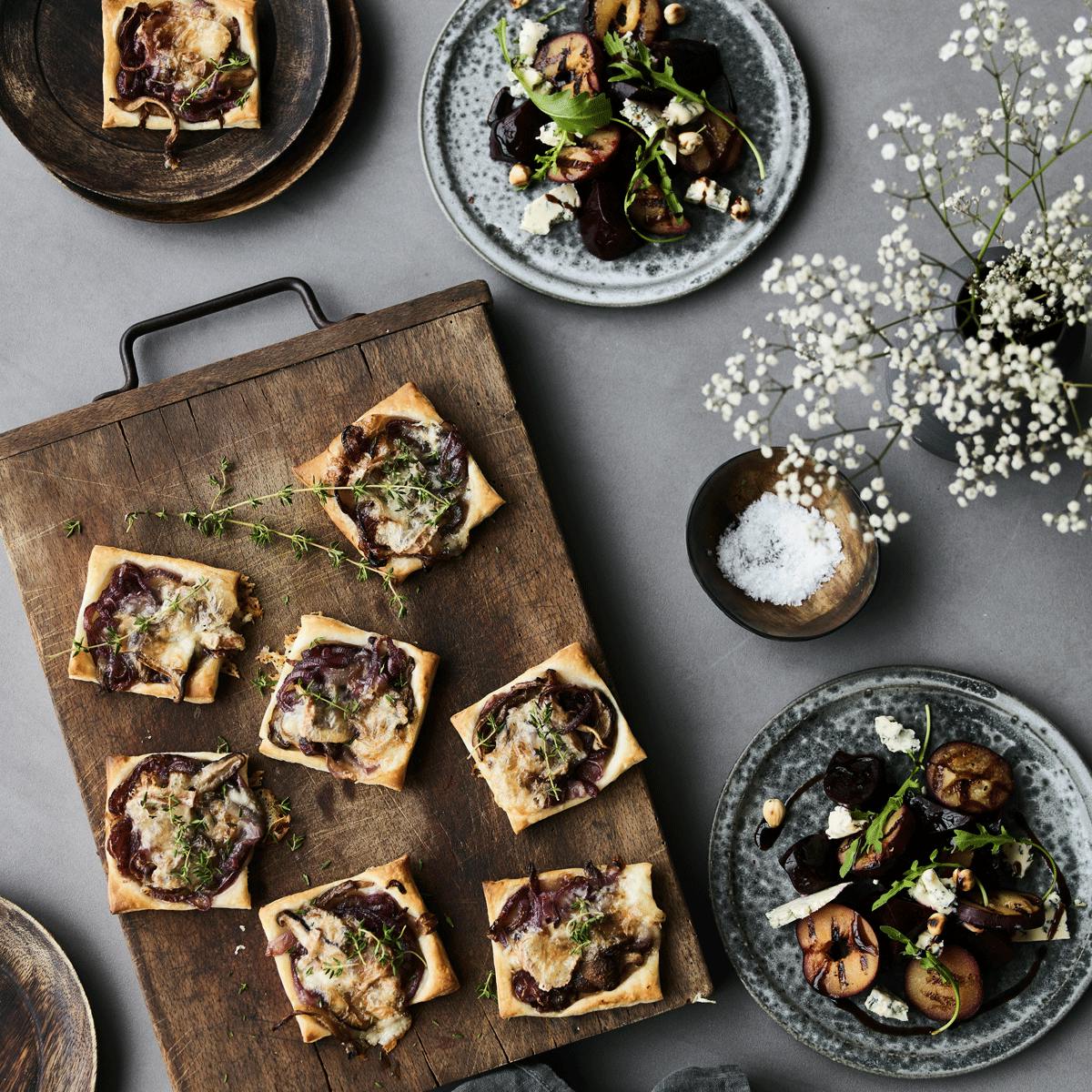 Lav små fine tærter til mange med karamelliserede løg. Et sikkert hit på påskebordet.