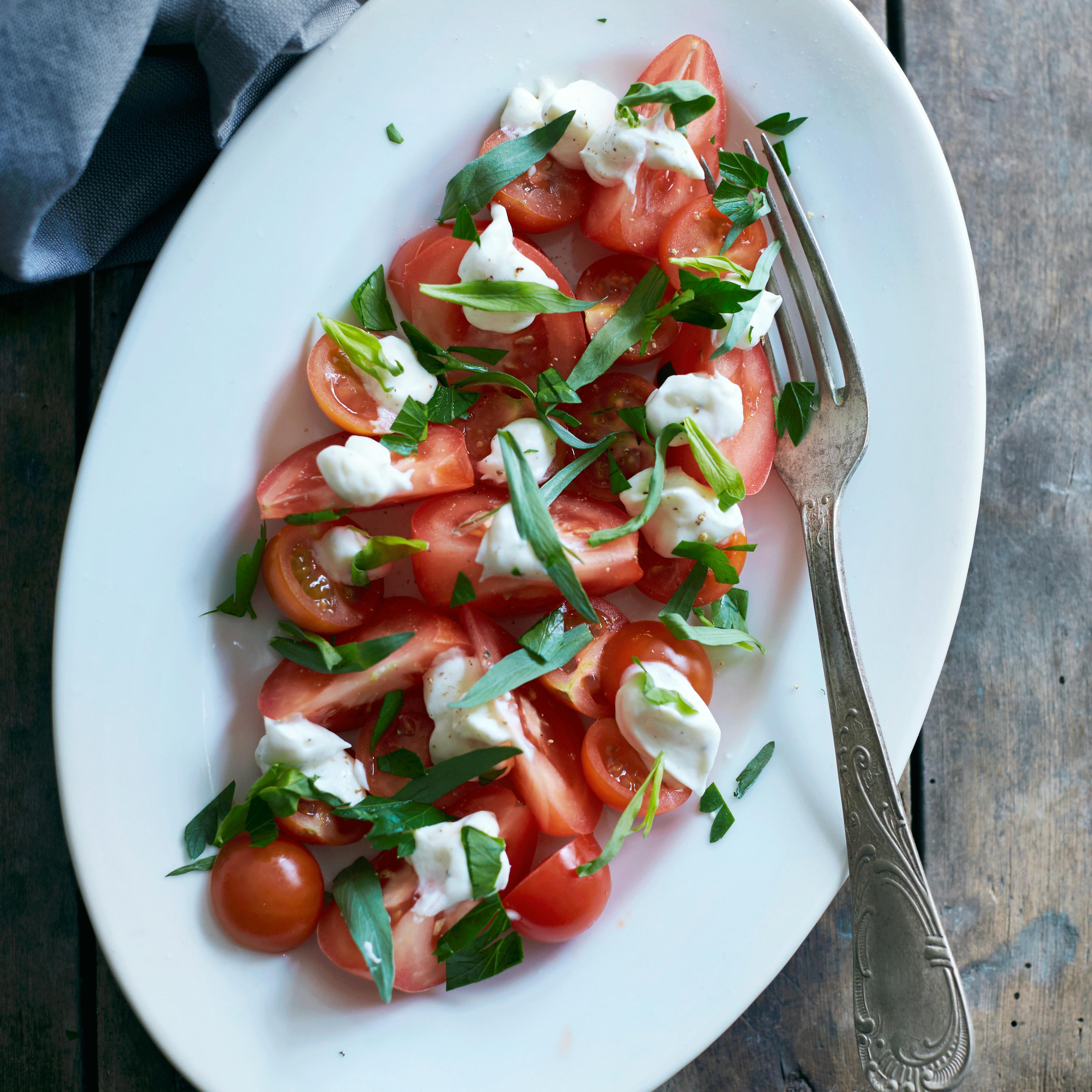 Lav en tomatsalat af friske tomater og med en skøn gedeost-dressing og friske krydderurter.
