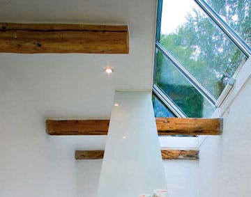 trætoppene igennem det skrå lysbånd, der løber i hele badeværelsets længde, og som betyder, at baderummet bogstavelig talt selv bader i dagslys. Det kraftige tømmer er nu afrenset og ligger synligt på tværs af rummet og giver en god kontrast til det hvidskurede murværk, der med vilje er lavet meget råt. Store kvadratiske gulvfliser giver en god bund til det meget lyse og lette rum.