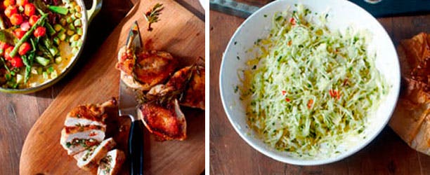 KYLLING Læg kyllingestykkerne med skindsiden nedad på et stort stykke bagepapir. Snit en lomme fra siden ind i hver med en lille kniv, så kødet kan åbnes som en bog. Fordel fyldet fra brættet i lommerne, klem det let og fold kødet tilbage, så fyldet lukkes inde. Vask hænderne. Hæld 2 sjatter olivenolie i den tomme stegepande. Læg kyllingestykkerne i med skindsiden nedad; brug en madtang. Krøl et stykke bagepapir sammen under den kolde hane. Glat papiret ud igen, læg det over kødet og lad kødet stege. Ryst panden af og til.