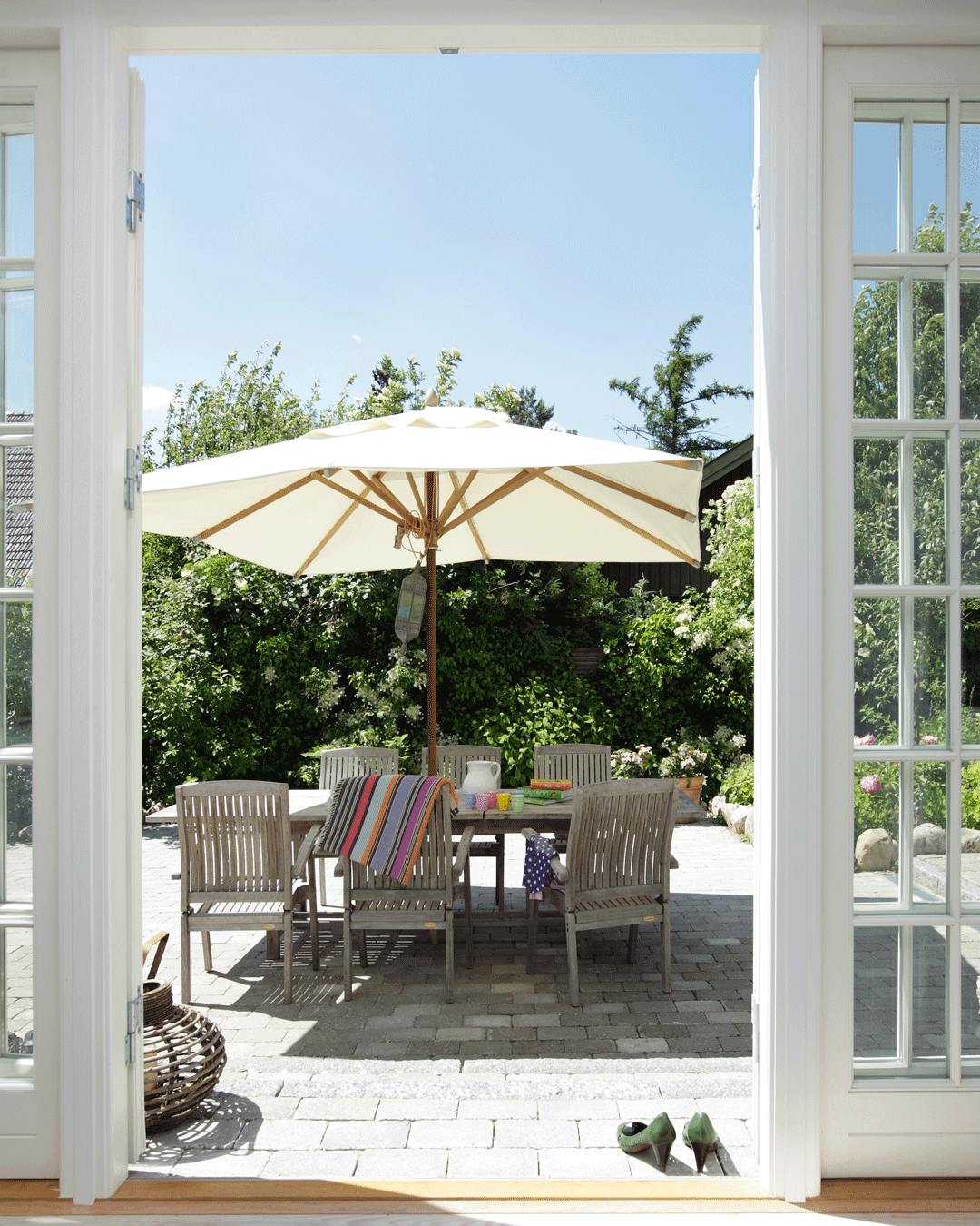 En stor parasol kan ikke bare bruges til at skærme for sollyset – den er også med til at definere og afgrænse dit uderum.