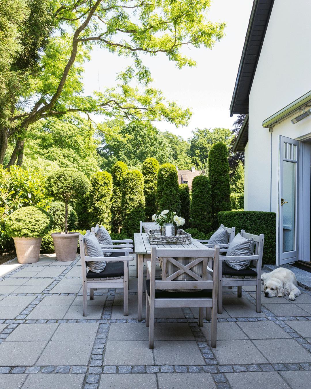 Få inde og ude til at smelte sammen ved at lægge fliser lige udenfor døren. Så er der direkte adgang til havebord og grillarrangement.