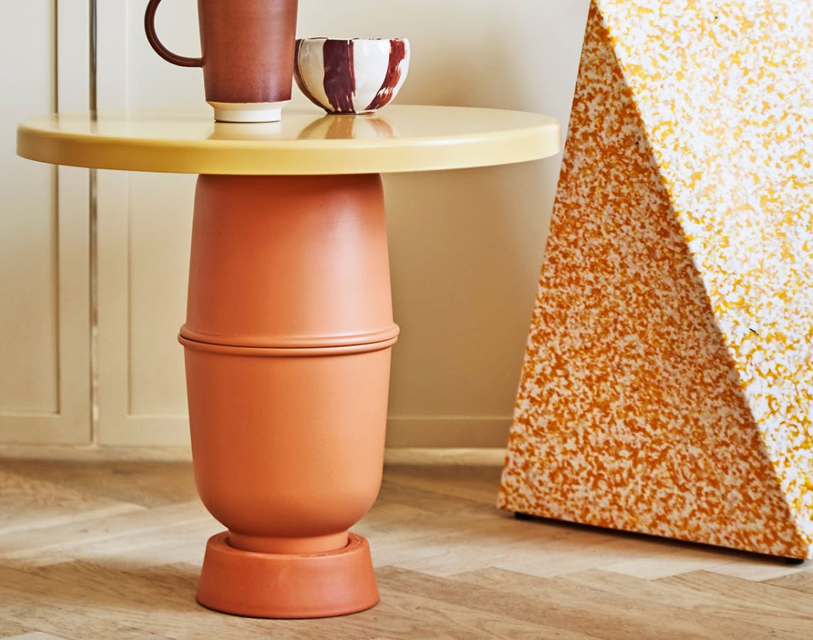 Hvem siger, at potter kun kan bruges til planter? Tør man tænke ud af boksen og udfordre måden, vi normalt bruger tingene på, kan man få både sjove, flotte og unikke, nye møbler ud af det. Lerpotterne bliver her vendt på hovedet, i bogstavelig forstand, og brugt som søjle til et skulpturelt sidebord.