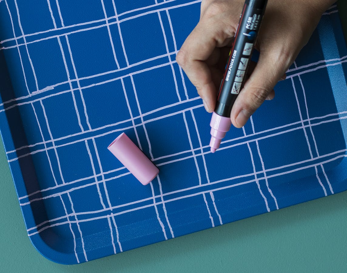 5. Når bakken er helt tør, tegn lyserøde tern med posca-tusch. Ønsker du lige streger kan du bruge en lineal – vi har tegnet i frihånd, der giver ternene en “levende” streg.