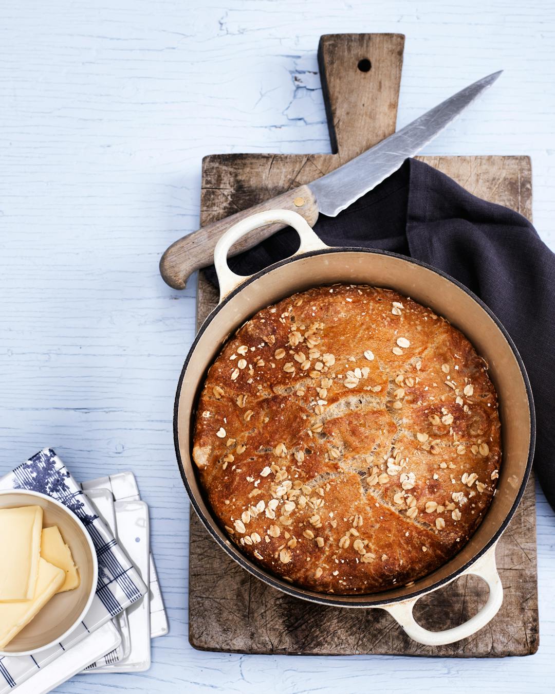 Træt af klistrede fingre, når du bager brød? Hvis du har en gryde med låg, som kan gå i ovnen, kan du bage et grydebrød, hvor dejen slet ikke behøver æltes. Det bedste at bruge er en tung støbejernsgryde (ca. 4 l) med tætsluttende låg, men andre gryder eller en römertopf kan også bruges.