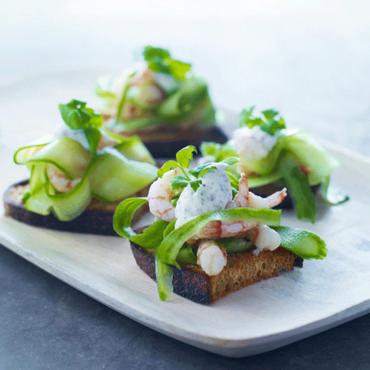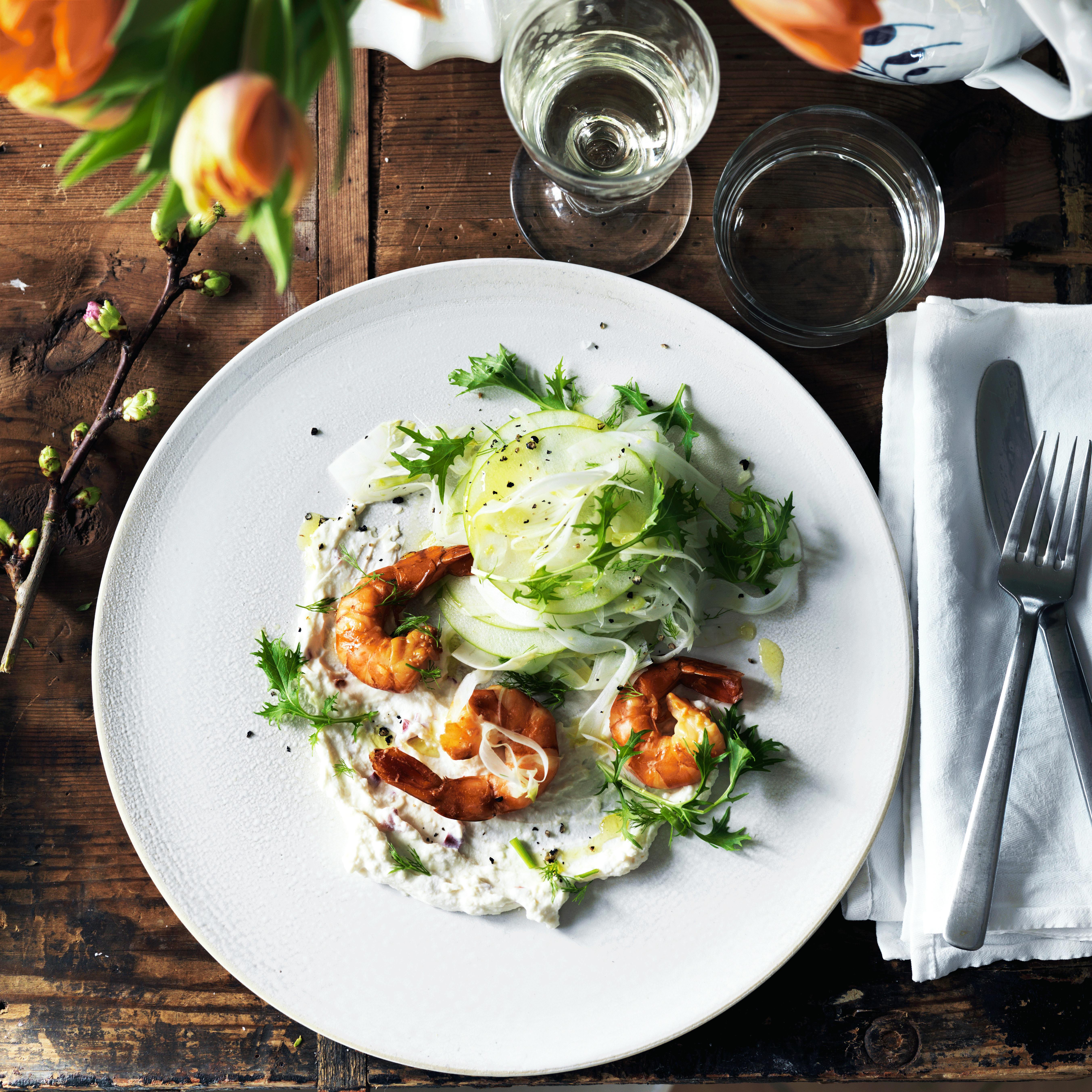 Lav grillede røgede tigerrejer med ricottaost og æble-fennikelsalat som fiske-forret i til din påskefrokost.