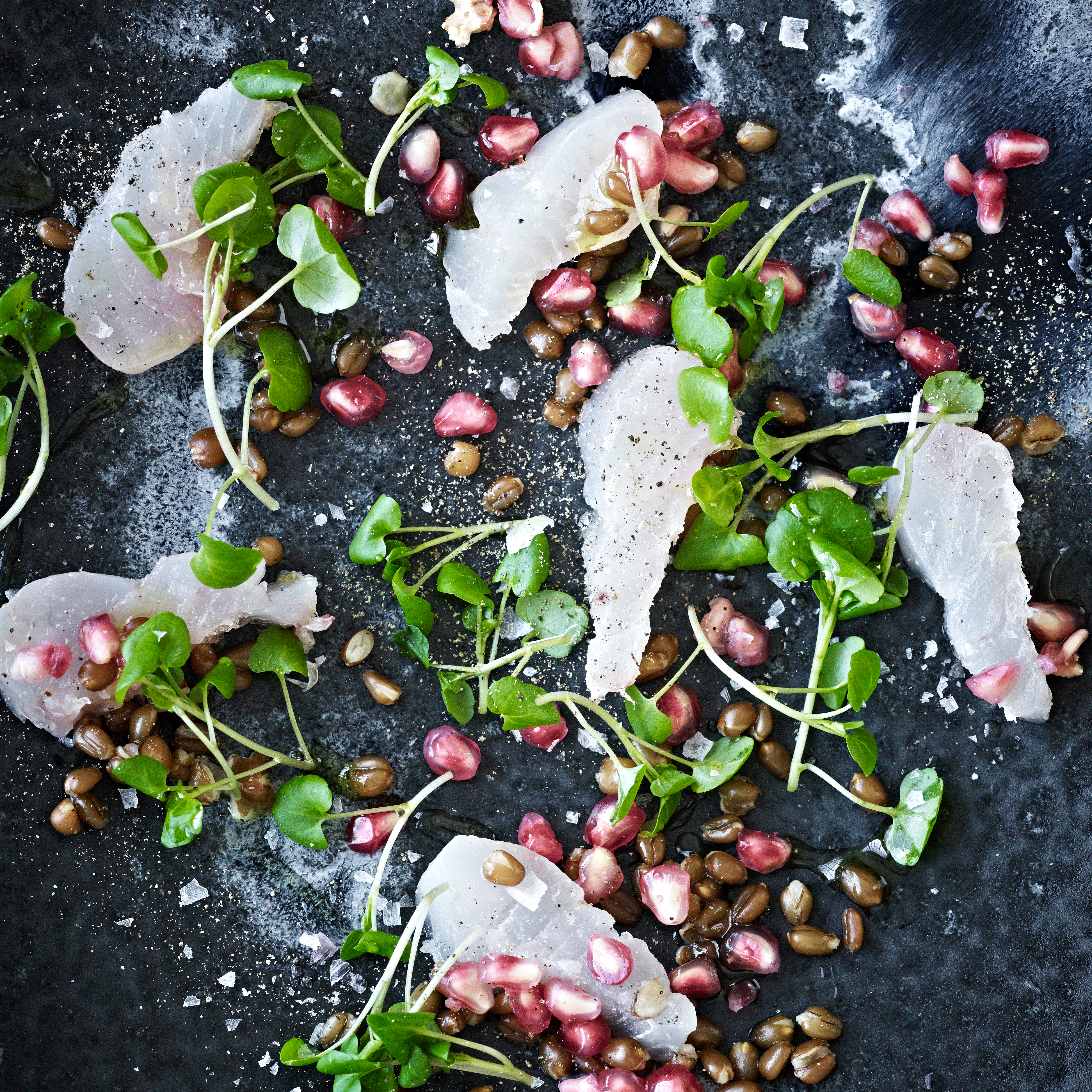Brug kerner og saft af granatæbler i din madlavning i denne fiske-forret af saltet torsk med granatæble, brøndkarse og spelt.