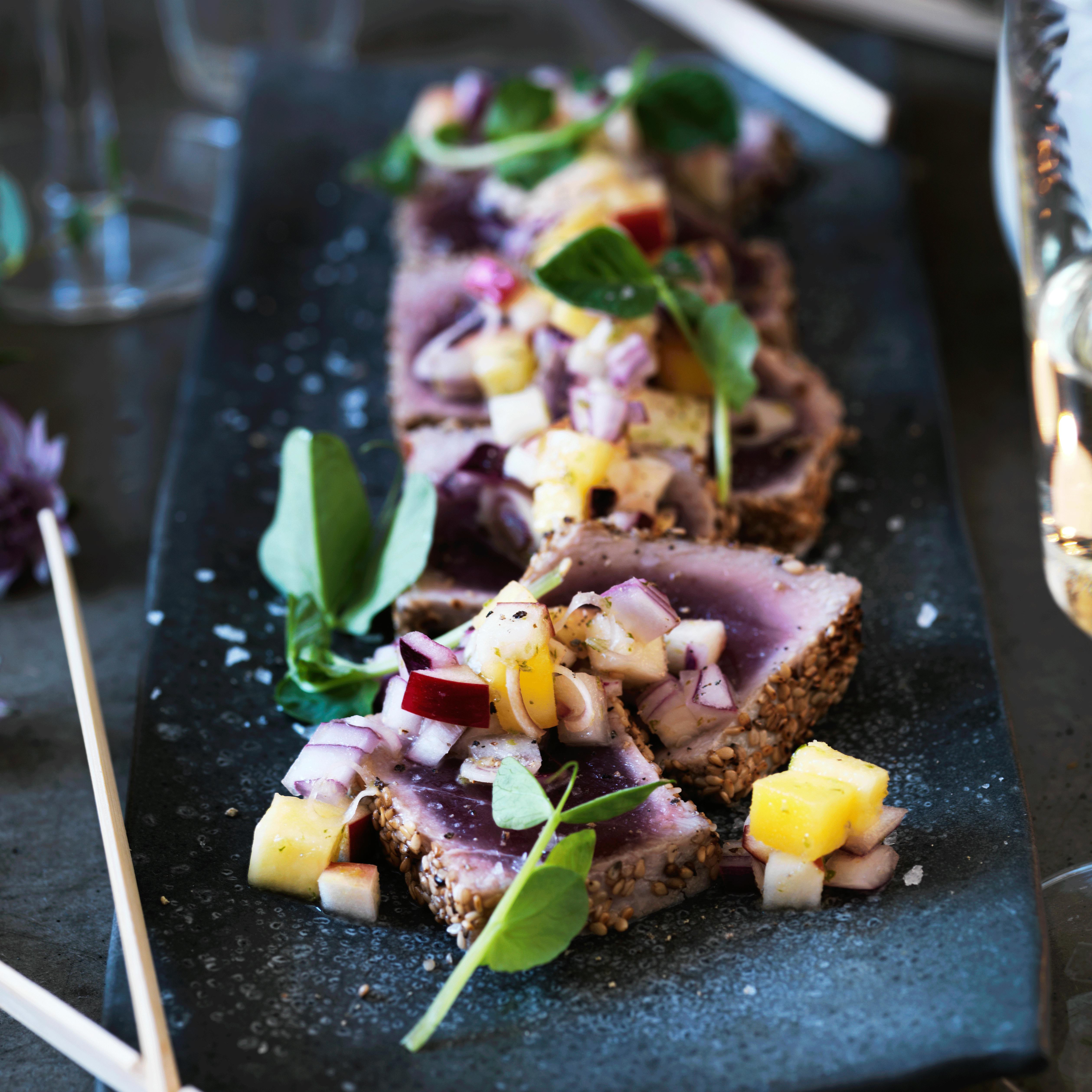Giv dine gæster en fiske-forret, de sent vil glemme med denne lynstegt tun med æble-mangosalsa og ærtespirer.