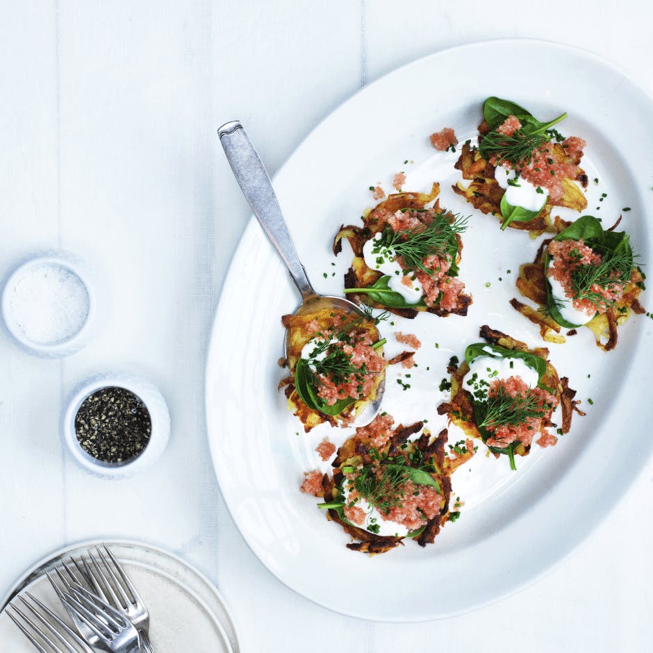 Prøv denne fiske-forret, hvor blinis er skiftet ud med små røsti hapse i stedet.