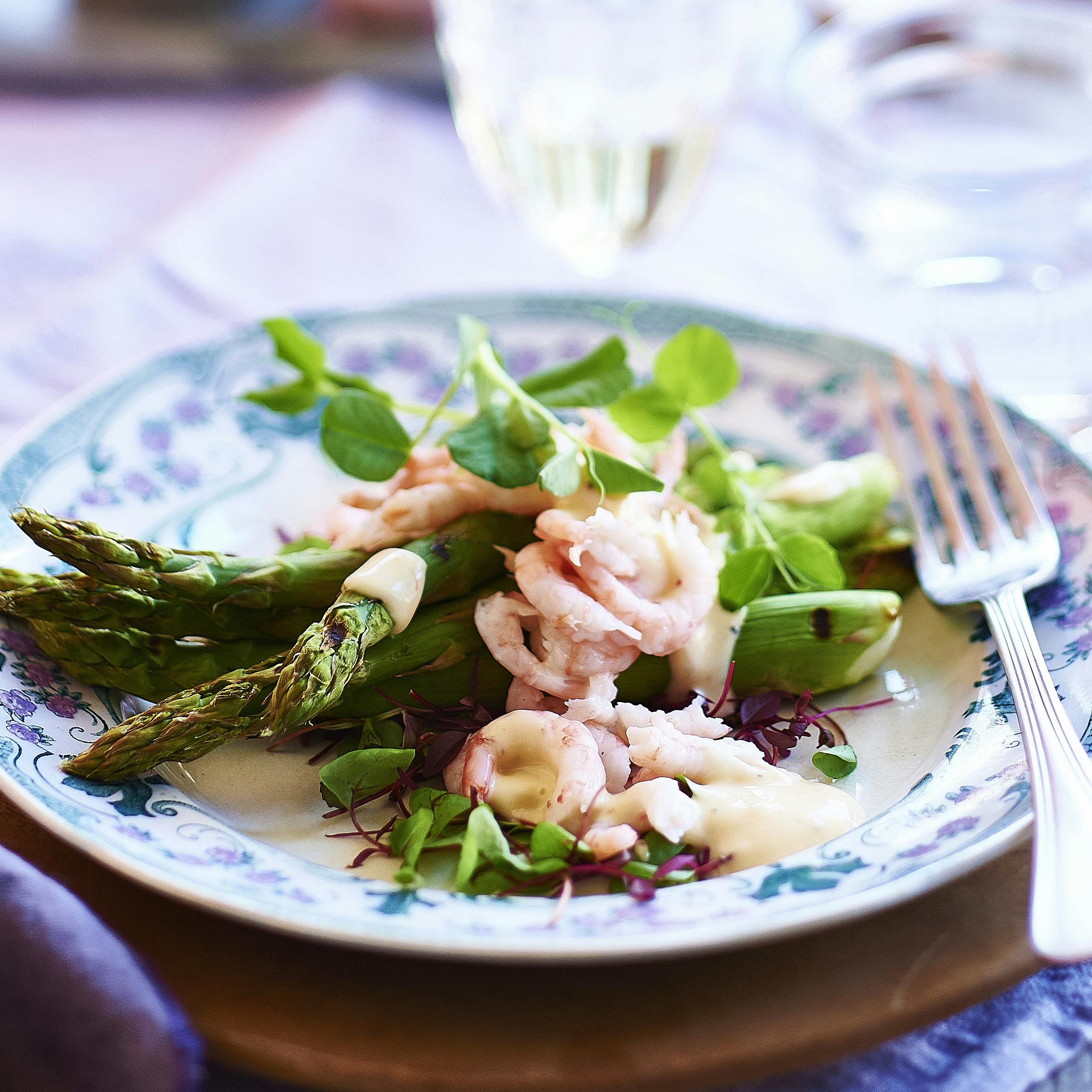 Der er noget helt særligt over danske asparges - især når de har fået en tur på grillen. Servér dem med rejer, dildcreme og frisk stenbidderrogn, når det er i sæson. Opskriften her er til 6 personer som forret.