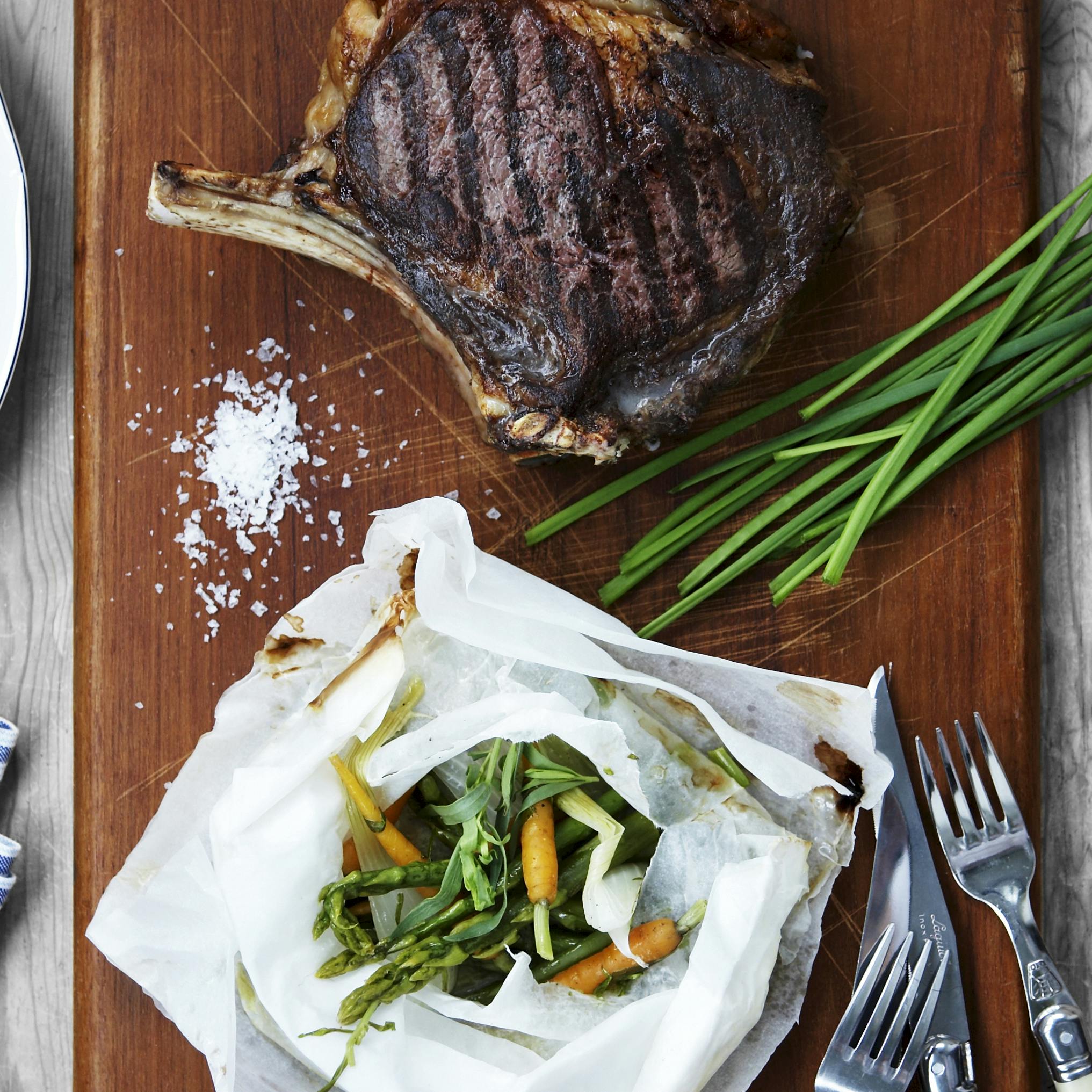 Glem de klassiske grillpølser for en stund, og servér en lækker oksekotelet med masser af sommergrønt. Med denne opskrift kan du slå to fluer med et smæk, for det hele kan tilberedes på ingen tid!
