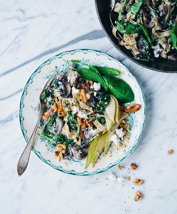 Prøv denne lækre opskrift på fettucine med svampe, gedeost, pære og valnødder fra bogen "Green Kitchen derhjemme" - eller se flere opskrifter helt uden kød i galleriet nederst i artiklen.