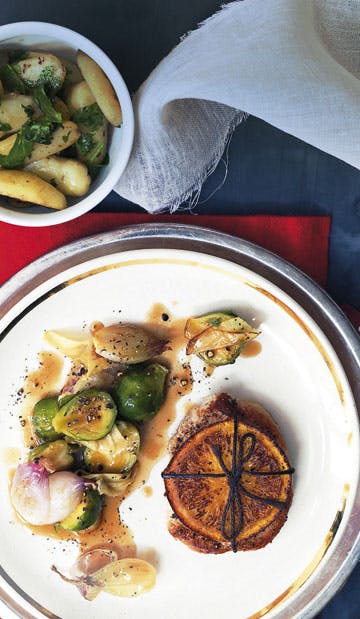 Krydr koteletterne godt med salt og peber. Skær appelsinen i skiver, læg en appelsinskive på hver kotelet, og bind den fast med kødsnor. Steg koteletterne i olie ca. 3 min. på hver side. Smelt sukker og smør til en brun karamel. Vend rosenkål, skalotteløg, ingefær og allehånde deri, og lad det karamellisere i ca. 5 min. Anret koteletten med karamelliserede rosenkål og skalotteløg samt stegte aspargeskartofler.