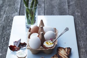 Spis et blødkogt æg med det samme med bacon, asparges, grillet brød, havsalt og friskkværnet peber.