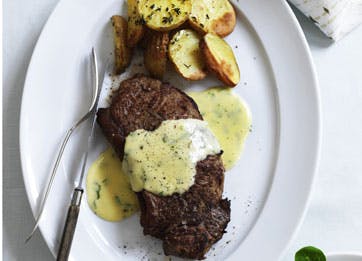 Brun bøfferne på begge sider i smeltet smør, tag dem fra varmen, og krydr med salt og peber. Steg bøfferne færdige i en 180° varm ovn i 7-10 minutter, og lad dem hvile i 5 minutter, før du serverer dem med kartoflerne og saucen.