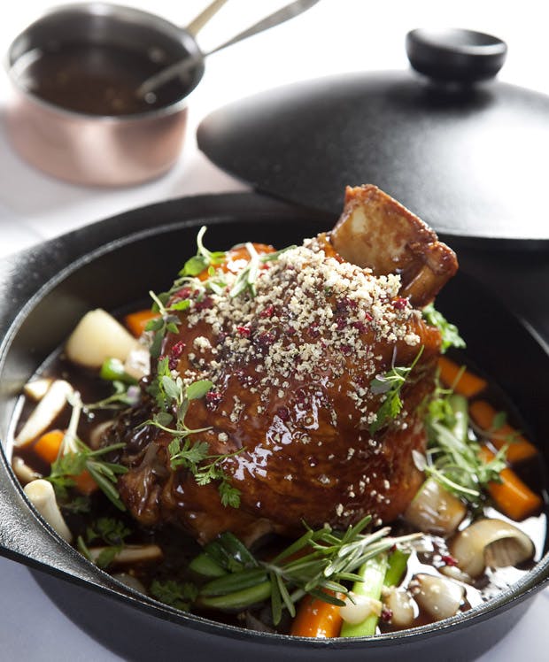 - Hæld saucen over skanken og drys med brødblandingen.