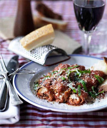 Trin 6: Fordel dine cannelloni i et ovnfast fad, og hæld tomatsauce over. Riv den sidste parmesan over pastaen, og bag den i en forvarmet ovn ved 200° i 25-30 minutter, indtil pastaen og osten er gylden. Server med revet parmesan og godt brød.