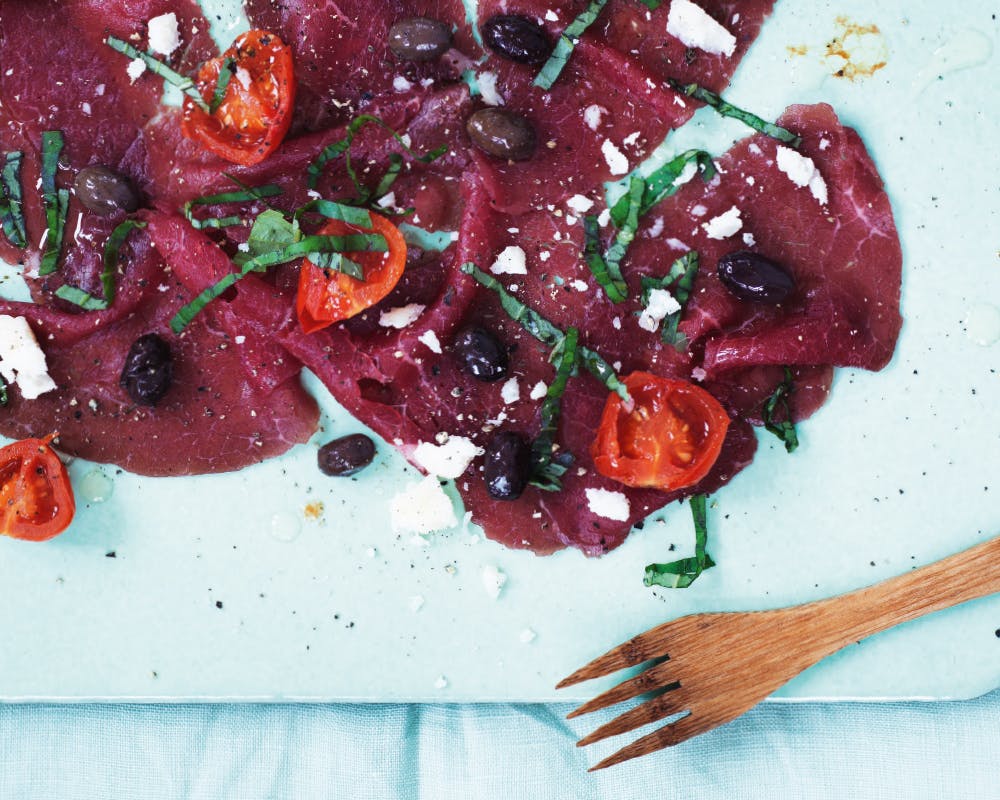 Anret kødet på en tallerken, dryp med trøffelolie, og fordel de bagte tomater over. Drys med oliven og parmesan brækket i små stykker. Skær basilikumblade i tynde strimler, og drys over. Krydr godt med salt og peber.