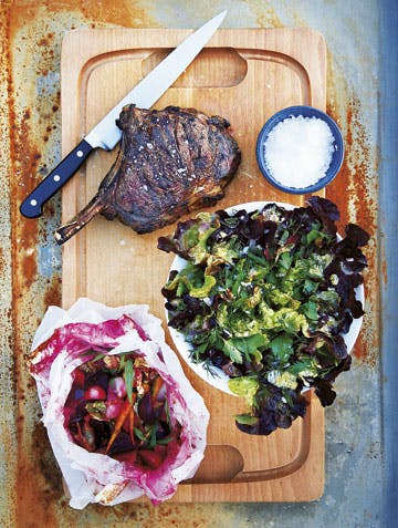 Krydr de to oksekoteletter med peber, og pensl med olivenolie. Brun kødet på en grillpande i 3 min. på hver side, og steg det herefter i 30-40 min. ovnen ved 200°. Lad det herefter trække i 10 min. Skær kødet fra benet, og skær det i tynde skiver. Krydr med havsalt.