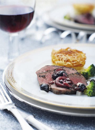 Dyrefilet: Sørg for at dyrefileten er renset for sener. Få evt. slagteren til at gøre det. Knus enebær og peberkorn i en morter. Bland i en skål enebær og peberkorn med timian og olivenolie. Tør kødet med køkkenrulle og gnid krydderiblandingen ind i kødet. Brun kødet på alle sider på en hed pande i 3-4 min. på hver side. Steg herefter kødet 8-10 min. i ovnen ved 200°. Tag kødet ud og dæk fadet til med sølvpapir og et viskestykke og lad det trække 10 min.