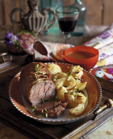 Gammeldags kalvesteg stegt som vildt og selleri-kartoffel-kager med ost samt karamelliserede pærer og løg