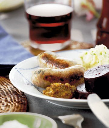 7. Steg pølserne på en pande i lidt olie eller smør cirka 3 minutter på hver side. Pølserne kan også koges først og derefter steges. Server fasanpølserne med sellerimos, syltede rødbeder og grov sennep.