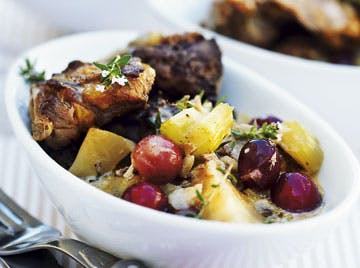 Tilsæt tranebær og druer, og lad retten simre yderligere 10 min.