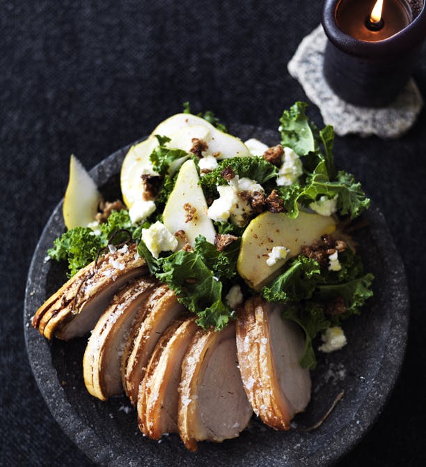 Det er julet uden at være tungt og traditionelt, når du serverer flæskesteg med frisk grønkålssalat med gedeost, ristet rugbrød og pære.