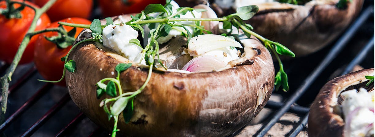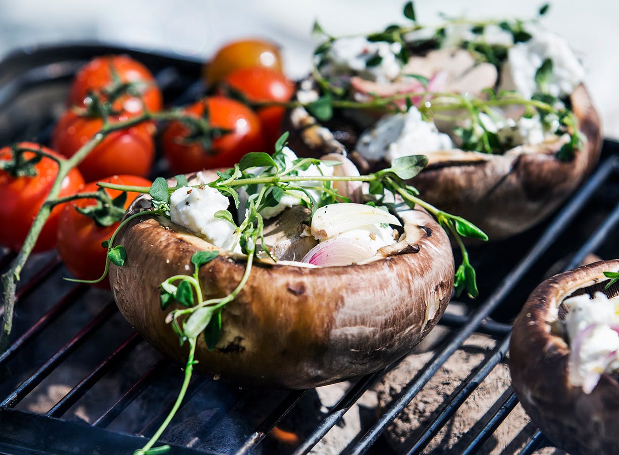 Fyldte portobellosvampe er super lækkert og kan laves på mange forskellige måder. Prøv denne version med gedeost, timian, hvidløg og citron. (link fjernet)