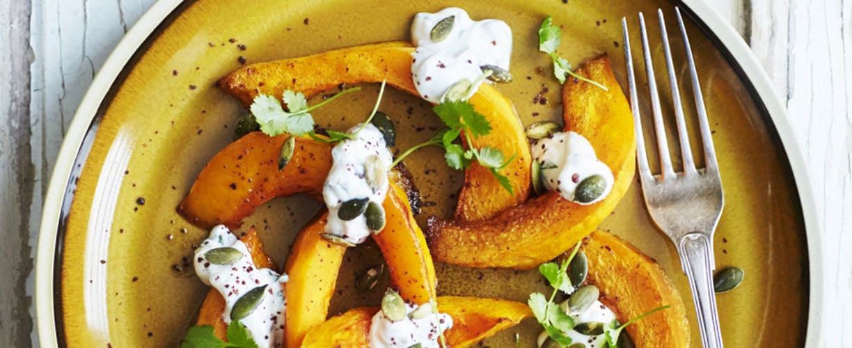 Når en tung hovedret og dessert venter, kan det være en god ide at lade forretten være 100 % vegetarisk - så lægger den sig knap så bastant i maven. Prøv derfor denne skønne opskrift på bagt græskar! (link fjernet)
