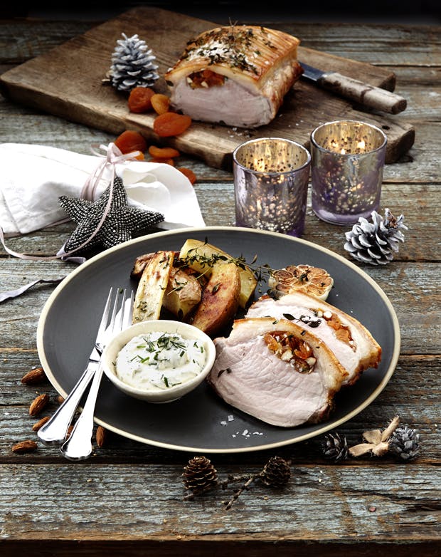 Du har helt sikkert fået den traditionelle flæskesteg med kartofler, sovs og rødkål til. Enten i julen eller som hovedret i en klassisk dansk menu. Men flæskestegen kan meget mere end det, og når du fylder den med saftigt og smagfuldt fyld, får den helt nyt liv. Serveret sammen med de timianstegte kartofler og den skønne hvidløgsdip kan den nemt gå hen og blive en ny favorit på middagsbordet!