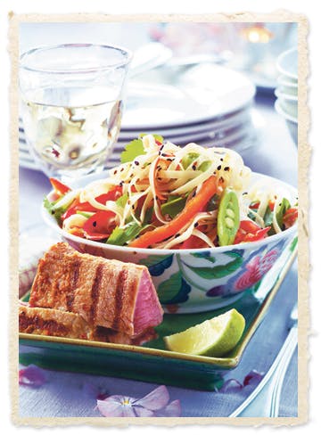 Grill tunen lige før servering Opvarm en grillpande eller en almindelig pande, til den er glohed. Grill tunen i 2 minutter på alle sider - hvis det er bøffer, skal de have kortere tid. Skær tykke blokke af tunen, og server til nudelsalaten.