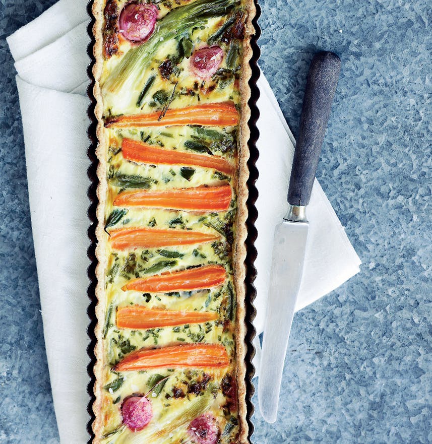 Miks nye sprøde grøntsager i denne tærte, og lav en mager creme med rygeost til at komme ovenpå - perfekt kombination til en let aftenmad. Grøntsagstærten smager også lækkert som tilbehør til kød eller fisk, og den kan nydes både kold og lun.