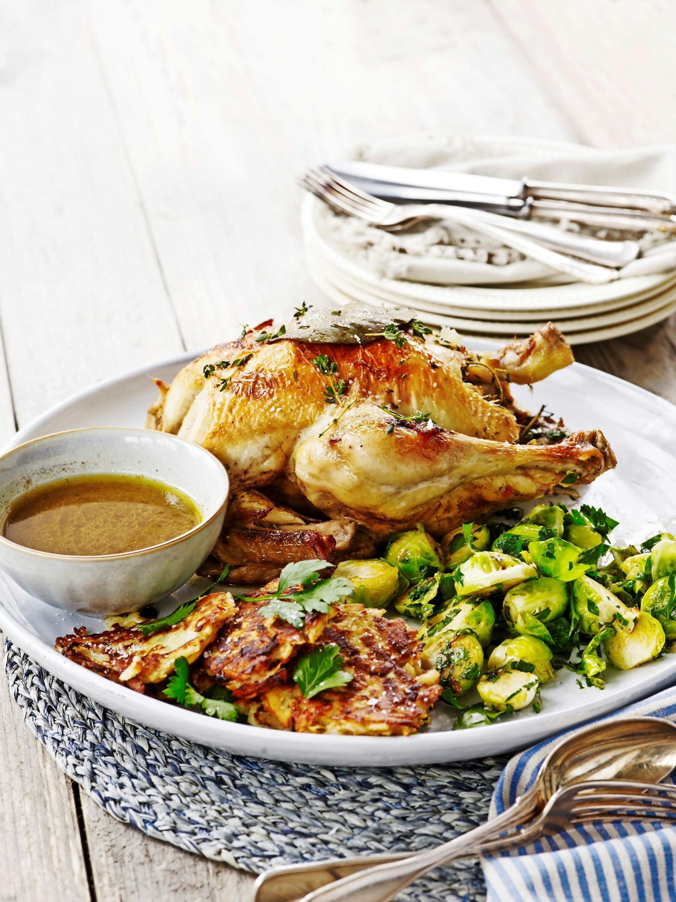 Læg kyllingen tilbage i gryden sammen med laurbærblade og den resterende timian, løg og æbler.