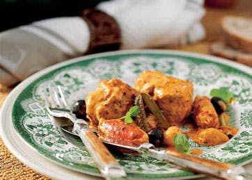 Steg i nogle minutter, og tilsæt fløde. Læg låg på, og lad det hele simre i 20 minutter. Lige inden servering: Tilsæt hakkede cornichoner og sorte oliven.